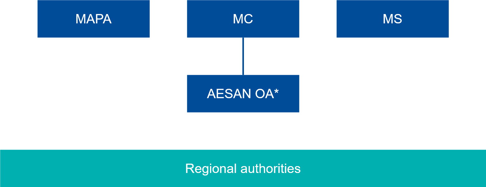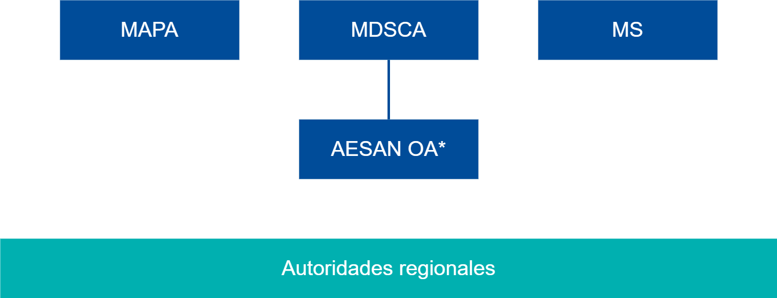 El Ministerio de Agricultura, Pesca y Alimentación (MAPA) es responsable de la política agraria, la sanidad animal, la seguridad alimentaria en la producción primaria, la fitosanidad, el bienestar animal, la calidad de los alimentos y el control del fraude en la industria alimentaria. El MAPA desarrolla proyectos de legislación nacional y es responsable de la coordinación de los controles oficiales, incluidos los controles de importación y exportación dentro del ámbito de su competencia.