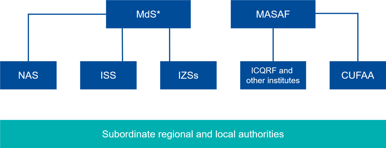 In Italy, most of the mandates for food and feed safety, animal health and animal welfare are assigned at the national level to the Ministry of Health (MdS), recently reorganised by the Decree of the President of the Council of Ministers No. 196 of 30 October 2023. In particular, the aforementioned responsibilities fall under the remit of the Department for Human Heath, Animal Health and the Ecosystem (One Health) and International Relations (DOHRI), with its Directorates-General: