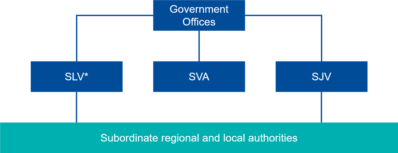 Within the Government Offices of Sweden, the Ministry of Rural Affairs and Infrastructure is responsible for agricultural policy and matters related to the entire food chain, including food safety. In close collaboration with other government ministries, policy issues related to food safety and the entire food chain are handled. As specified by their mandate, public agencies (i.e. SLV, SJV and SVA) provide support to the ministry.