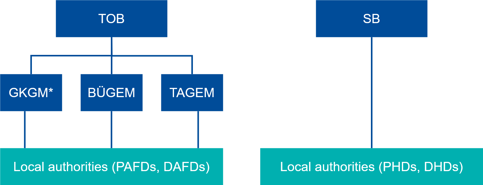 TOB consists of twenty-one units, three of them are involved in the development and enforcement of food and feed safety, veterinary and phytosanitary policy (i.e. the General Directorate of Food and Control (GKGM), General Directorate of Plant Production (BÜGEM), General Directorate of Agricultural Research and Policies (TAGEM)).